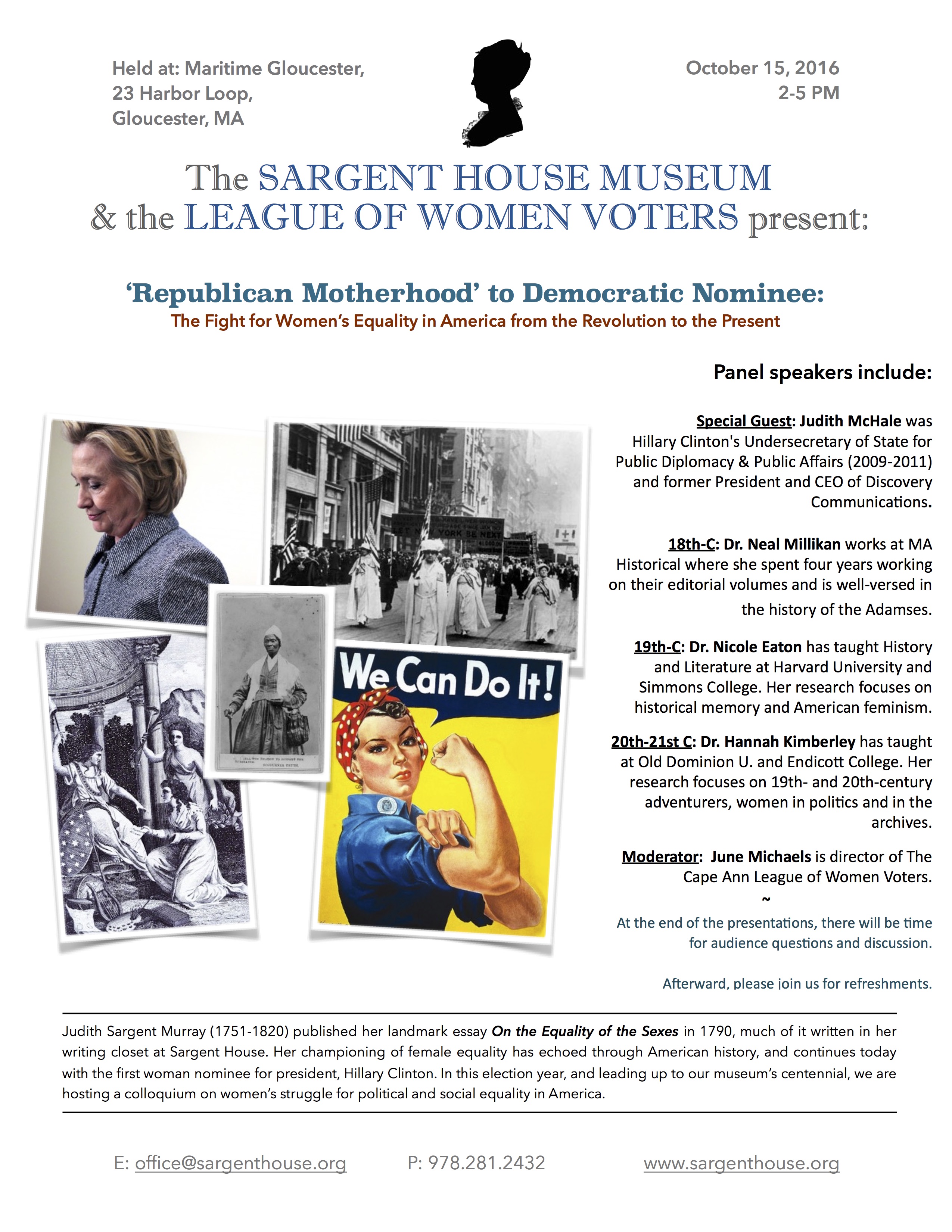October 15, 2016 Women’s Equality Panel, co-hosted by the Sargent House Museum and local Cape Ann League of Women Voters. (The live-stream video of which is available via the link here.)